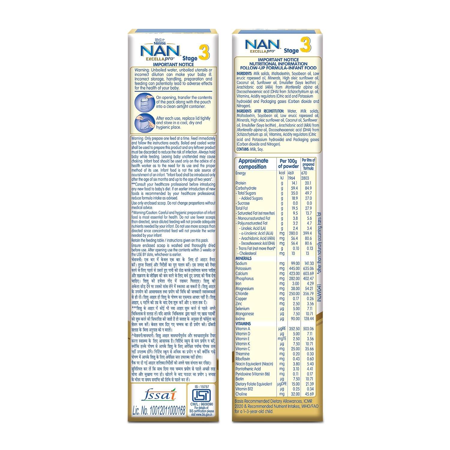 - Nestlé NAN EXCELLAPRO 3 is a spray dried follow-up formula with DHA, ARA, Vitamins A, C, D, Calcium, Zinc and Iron for toddler after 12 months and upto 24 months when they are not breastfed.