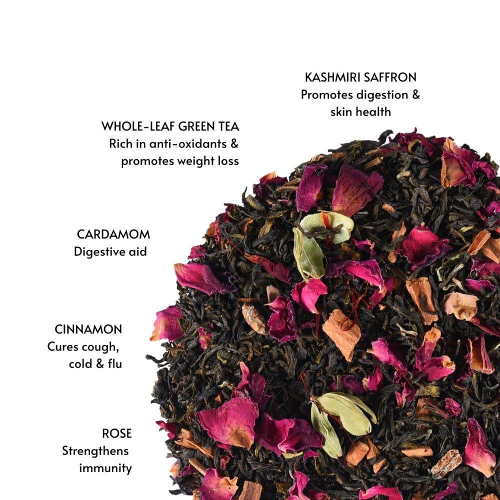 immunity booster & weight loss tonic | 30 servings (40 grams) A Kashmiri delicacy, the Kahwah is an exotic mix of green tea leaves, whole spices, rose petals & Kashmiri saffron strands. It is a heart-warming beverage that beautifully resonates with the power of Indian spices. A perfect tea to welcome the winters, it is sure to teleport you to the beautiful snow-clad mountains of Kashmir and with every sip one encounters the age-old culture of this breathtakingly beautiful place. Ingredients: Green tea, Cinnamon, Cardamom, rose, saffron Why we recommend it? - Cures cold, cough & flu - Aids weight loss - Improves skin health - Energy booster The perfect brew: Boil 150 ml of water at 85° C. Add water over 2 tsp of tea leaves & steep for 3-4 mins. Strain, sip & relax. Best time for sipping: Make a fresh start to your day by sipping this ancient tea in the morning. Storage instructions: Store in a cool & dry place. Away from heat & humidity. |