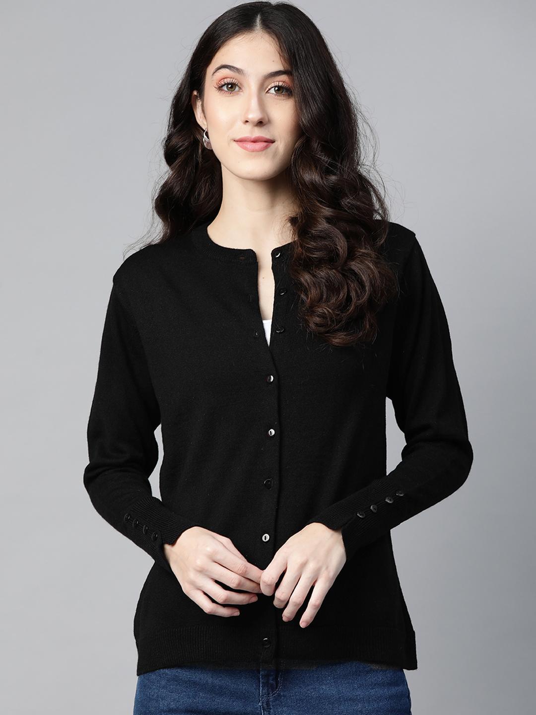 Women Brown Round Neck Cardigan With Buttoned Sleeves - L